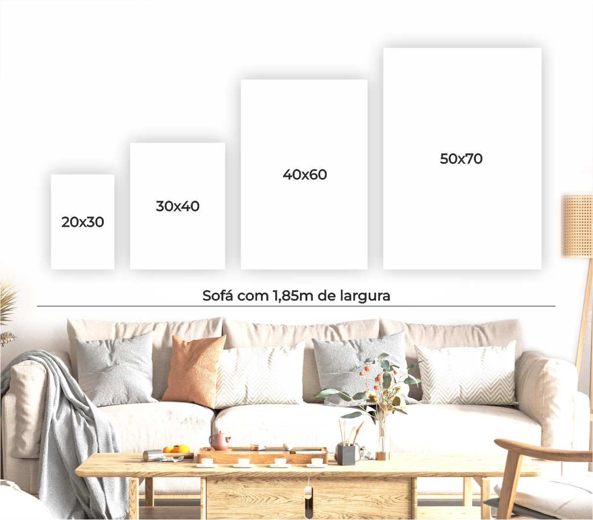 Disponibilizamos várias opções de tamanho. Para ajudar, incluímos um guia visual que mostra como cada modelo ficará na parede — facilitando a escolha ideal para seu espaço.