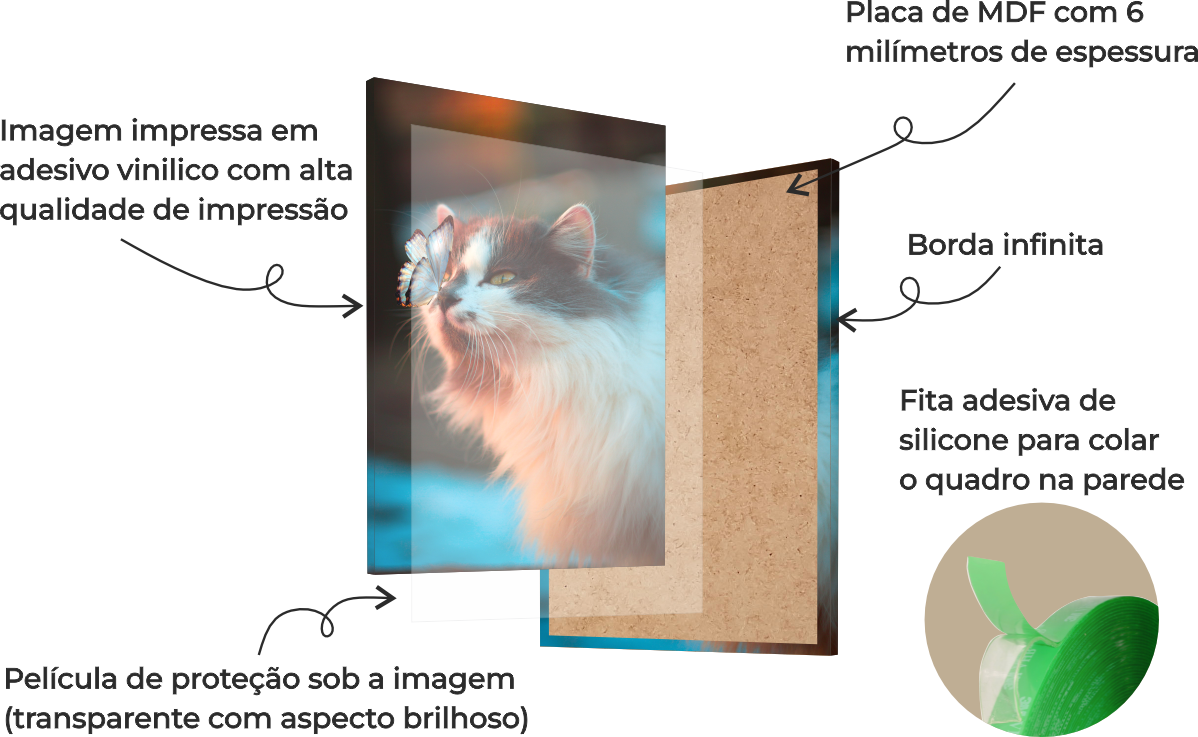 Nossos quadros são produzidos em placa de MDF de 6mm, garantindo resistência, praticidade e durabilidade. A imagem é impressa em adesivo vinílico de alta qualidade, aplicada cuidadosamente sobre a placa e finalizada com uma película protetora transparente, que mantém as cores vivas, evita riscos e aumenta a durabilidade da peça.